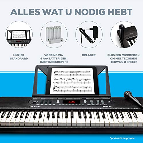 Alles wat je nodig hebt – Bevat een muziekstandaard, een stroomadapter (werkt ook met 6 AA-batterijen, niet inbegrepen) en zelfs een microfoon om mee te zingen terwijl je speelt.