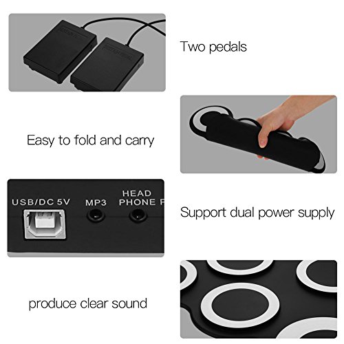 De 3,5 mm hoofdtelefoonaansluiting kan externe hoofdtelefoon of luidsprekers aansluiten, zonder anderen te hoeven storen. Compact en eenvoudig op te vouwen, zeer comfortabel te dragen en op te bergen. Ingebouwde 5 drum-settonen, 8 demosongs en 3 soorten ritmes voor gemakkelijker trainen. Ondersteuning van dubbele stroomvoorziening: USB-poort of 2 AAA-batterijen (niet meegeleverd). Perfect voor het leren en oefenen van kinderen of beginners, voor familieentertainment en voor ontmoetingen met vrienden.
